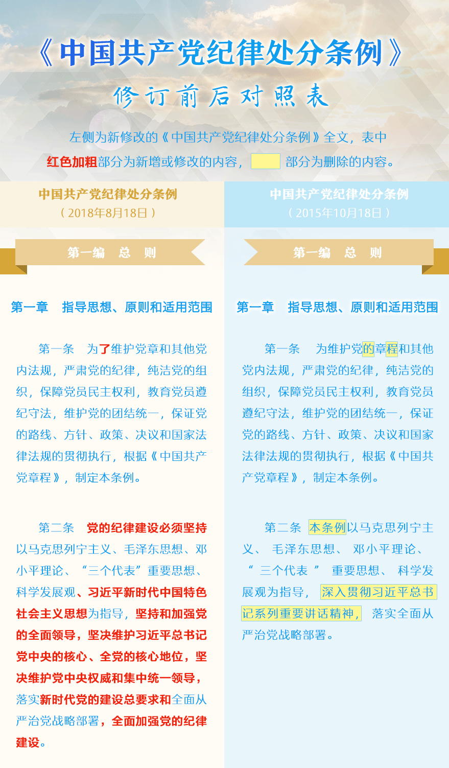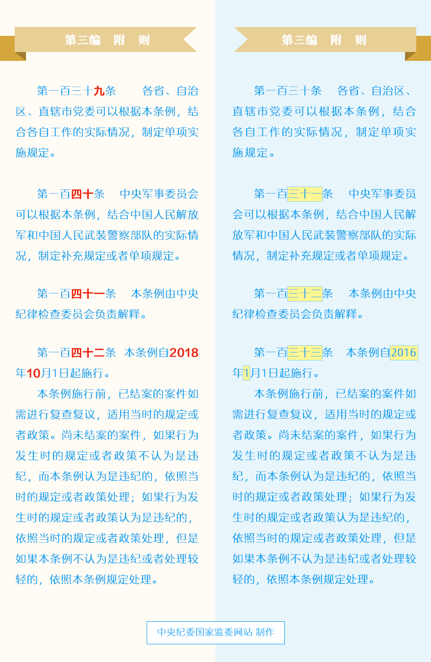 近日,新修订的《中国共产党纪律处分条例》正式公布。此次修订的《条例》与2015年修订的《条例》一脉相承(新旧对照表附后),是党中央站在新的历史起点上,全面贯彻习近平新时代中国特色社会主义思想和党的十九大精神,落实新时代党的建设总要求和全面从严治党战略部署,对坚持和加强党的全面领导、全面加强党的纪律建设作出的再部署、再动员,必将进一步提高纪律建设的政治性、时代性、针对性,使全面从严治党的思路举措更加科学、更加严密、更加有效。