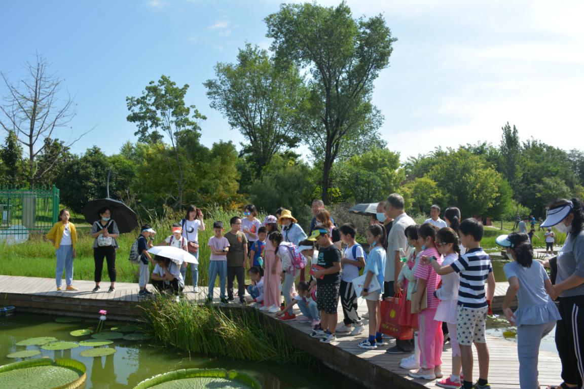 活动中,自然导师先带前来参与活动的小学生及其家长们认识各种水中精灵,有萌萌的狐尾藻,娇羞的睡美人—睡莲,亭亭玉立的荷花,更是有明星植物—王莲,老师通过一个个小问题,引导大家通过近距离观察了解了它们的形态特征和生长智慧。