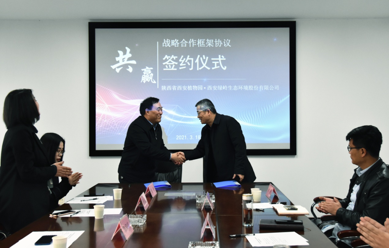为有效利用花卉种质资源,加强花卉品种创新,推动花卉产业化发展,2021年3月18日,陕西省西安植物园与西安绿岭生态环境股份有限公司共同签订战略合作框架协议。陕西省西安植物园主任岳明教授与西安绿岭生态环境股份有限公司董事长陈合亮代表双方签约。