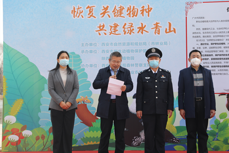 2022年3月3日,以“恢复关键物种、共建绿水青山”为主题的西安市第九个“世界野生动植物日”宣传活动在陕西省西安植物园举行。该活动由西安市自然资源和规划局(市林业局)主办,西安野生动植物?;す芾碚竞蜕挛魇∥靼仓参镌傲铣邪?。国家林草局驻西安专员办副专员贾永毅、西安市自然资源和规划局(市林业局)局长冯涛、西安市雁塔区农业农村和林业水务局局长于建国、陕西省西安植物园主任岳明等人出席并讲话。西安市野生动植物?;す芾碚菊境ふ诺遣种鞒只疃?。
