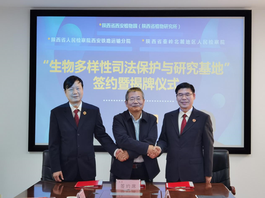 日前,陕西省西安植物园(陕西省植物研究所)、陕西省人民检察院西安铁路运输分院、陕西省秦岭北麓地区人民检察院三个共建单位共同签署了《生物多样性司法?;び胙芯炕毓步ㄐ槭椤?,旨在促进人与自然和谐共生,加强对生物多样性的司法?;び胙芯?。签约当天,陕西省首个“生物多样性司法?;び胙芯炕亍闭浇遗瞥闪?。