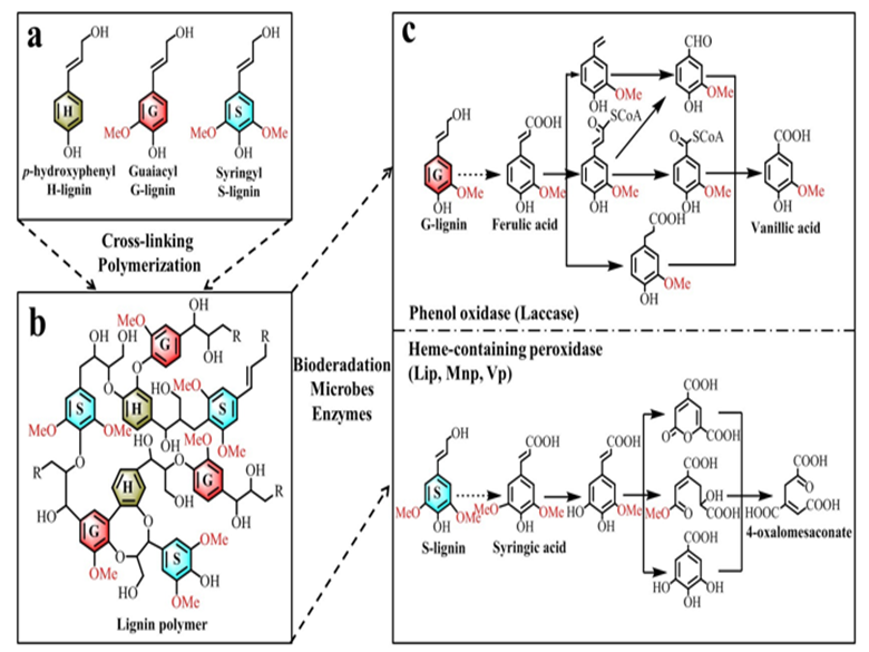 图1 木质素生物降解与化学转化的酶解机理和单体结构变化(图片:文章)