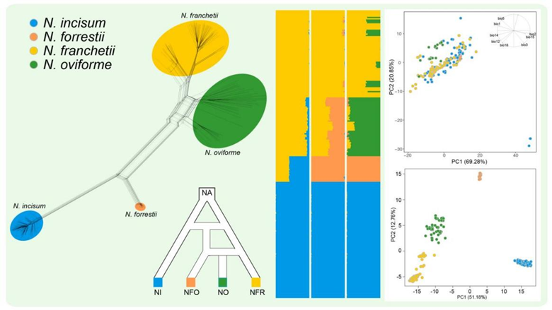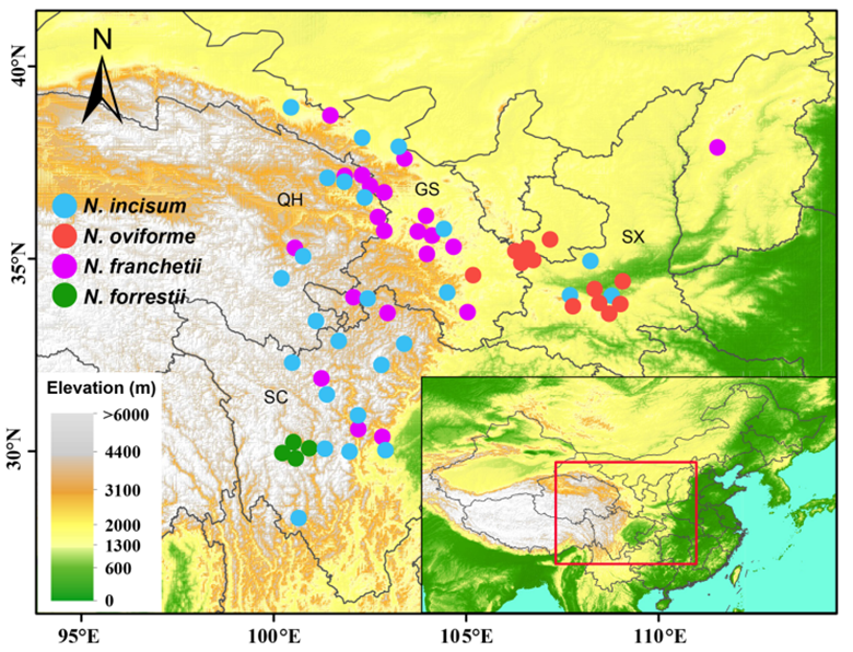 羌活属(Notopterygium)隶属于伞形科(Apiaceae),是我国特有多年生珍稀濒危草本植物,主要分布我国陕西、四川、青海、甘肃等省的高寒山区。该论文基于转录组测序(RNA-seq)开发 EST-SSR 分子标记以及简化基因组测序(SLAF-seq)鉴定单核苷酸多态性 SNPs 标记数据,利用系统发育树构建、主成分分析、演化历史模拟以及生态位分化等方法揭示了该属物种杂交起源及其物种形成历史。