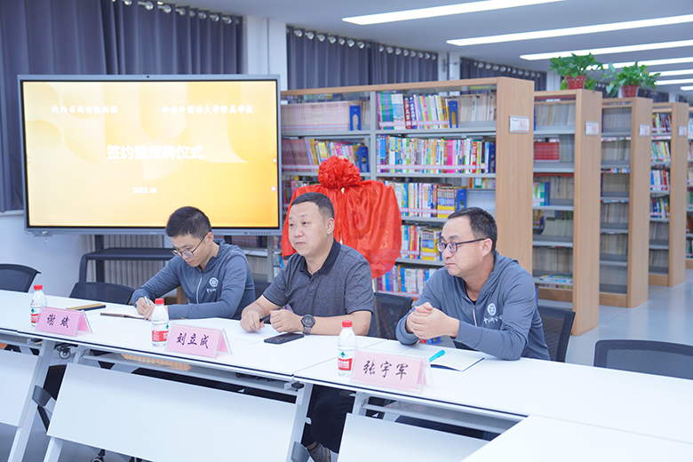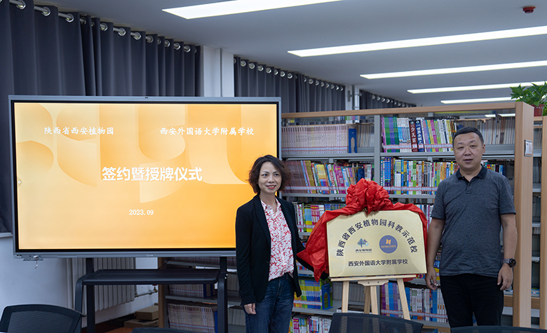 2023年9月20日下午,陕西省西安植物园科教示范校签约授牌仪式在西安外国语大学附属学校举行。陕西省西安植物园副园长刘立成、科普中心主任张宇军、运营中心副主任谢斌,西安外国语大学附属学校副校长张维、校长助理王鑫馨、科创中心主任施睿、党政办副主任韩心田参加了签约授牌仪式。