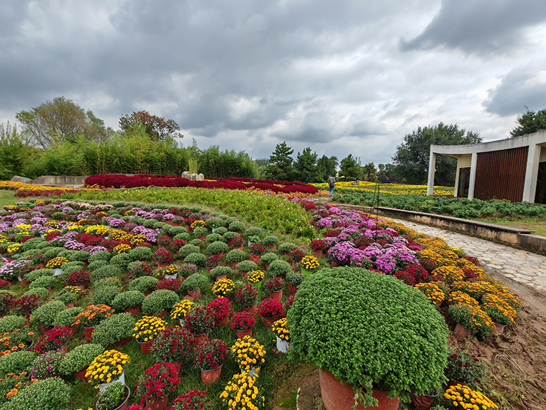 本次花展期间展出近3万余盆悬崖菊、塔菊、盆景菊、万寿菊等多种造型菊,30余种2万余株的品种菊花,并展出各类菊科花卉和其他应季花卉,约为3万余株。展区主要分布在西大门、水景园、本草园等区域,根据游览环线将3个区域连接起来,形成三区一环的赏花线路,以菊花盛景贯穿主要景观区域,让游客进入园区就能感受到花展氛围;水景园区域,以水生植物为主景观,沿岸通过展出盆菊和造型菊辅以水生植物、水上建筑景观等特色设施强化立体感,加上周围的树木、风车及充满童趣的景观小品,形成了一处独特的花海景观效果。同时,为了增加花展景观层次,丰富花展观赏内容,在种植风格上,还搭配了各种草花,如金鸡菊、超级鼠尾草、石竹、超级凤仙、彩叶草等,通过运用菊花、草花相互穿插搭配、增大局部种植密度、延长局部观赏区时间等方式,拼接出了一幅幅色彩斑斓的大地艺术品。不仅如此,今年花展在造型设计上通过嫁接、修剪、整形、绑扎等多种艺术手法,展示出形态万千的立体菊造型,并以各式花篮辅助强调层次结构,体现出花展意境,营造人与自然的和谐氛围。