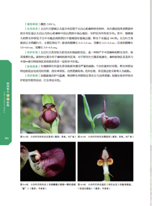 兰科植物是植物多样性?;ぶ械摹捌旖ⅰ崩嗳褐唬澜缢幸吧伎浦参镏掷嗑涣腥搿侗粑R吧参镏止拭骋坠肌罚–ITES)的?;し段?。陕西省分布的野生兰科植物种类均被列入国家或陕西省的重点保护野生植物名录。陕西省西安植物园(陕西省植物研究所)植物多样性监测与保护研究团队与陕西省自然?;で鸵吧参锕芾碚?、陕西长青国家级自然?;で芾砭值认喙氐ノ还餐献鳎?年余,对全省的野生兰科植物资源进行了详尽调查和系统整理,编写、出版了《陕西野生兰科植物》。该专著为A4开本,铜版纸全彩色印刷,共376页、57万字,系统收录了陕西省野生兰科植物共52属134种及2变种,表明了陕西省的野生兰科植物种类数量在全国34个省区中居于第13位、西北各省区中居于第1位。书中对陕西省野生兰科植物各属各种的名称、形态特征、花果期、生境、分布、保护级别、濒危等级、生存状况、?;ぜ壑怠⒅挛R蛩?、?;げ呗缘饶谌萁辛讼晗讣鞘?,并为绝大部分种类选配了野生状态下的彩色图片453张,具有较高的科研价值和观赏价值。该专著的出版、发行,不仅为陕西省兰科植物的科学研究、物种多样性?;?、野生植物资源保育等工作奠定了良好的基础,是陕西省野生植物多样性?;び肜谩⒗伎浦参镒试囱芯康攘煊虻难芯咳嗽奔鞍谜叩闹匾慰际?,而且展示了我省兰科植物资源最新、最全的基础数据,为制定陕西省野生兰科资源保护策略提供了科技支撑作用。