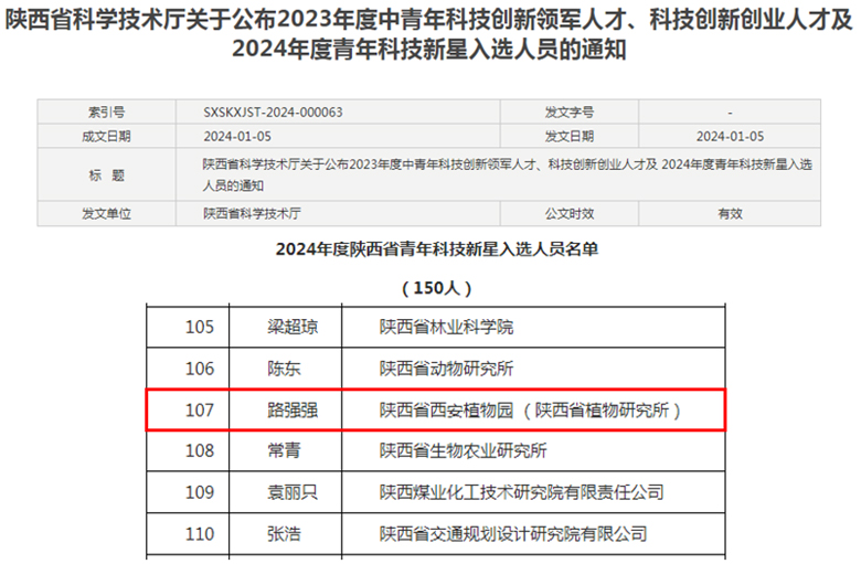 日前,陕西省科技厅公布了陕西省中青年科技创新领军人才、科技创新创业人才和青年科技新星的入选结果,根据《陕西省科学技术厅关于组织推选2023年中青年科技创新领军人才、科技创新创业人才、青年科技新星的通知》(陕科政函〔2023〕450号)有关申报评审程序,陕西省西安植物园路强强博士入选2024年度陕西省青年科技新星。截止目前,我园已有6名青年科研人员入选陕西省青年科技新星。