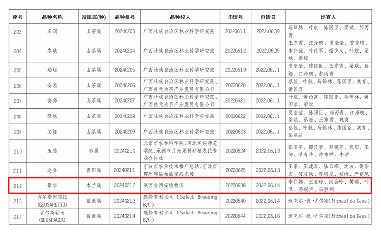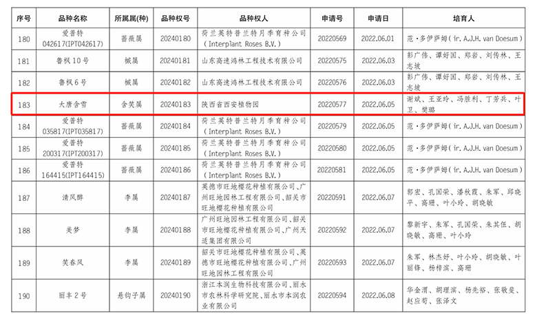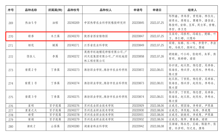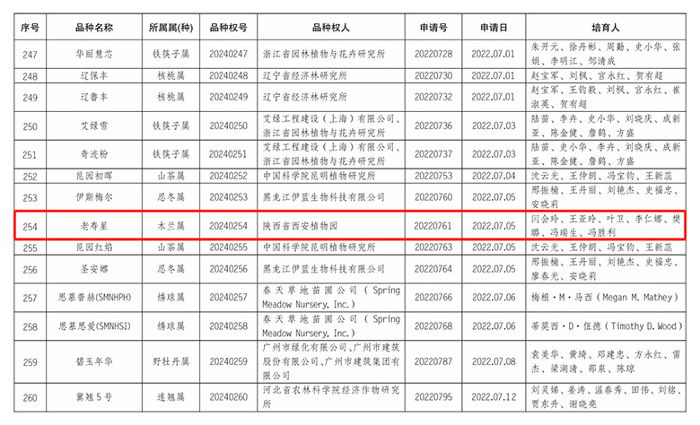 近日,在国家林业和草原局2024 年第一批授予的植物新品种权名单中,陕西省西安植物园又有4个木兰新品种获得证书。分别是大唐含雪含笑、老寿星玉兰、绿香玉兰和景华玉兰。