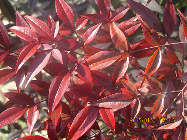 南天竹(Nandina domesticaThunb)是小檗科南天竹属常绿灌木,植株丛生,高约2m,老茎浅褐色,幼枝红色。2-3回羽状复叶互生,小叶椭圆披针形,深绿色;圆锥花序顶生,花小,白色,花期5-6月;浆果球形,初为绿色,成熟后为鲜红色,可宿存至翌年2月。原产中国、日本,多生于湿润的沟谷、灌丛中,园林上是优美的观叶、观果花卉,可露地栽培或盆栽观赏。