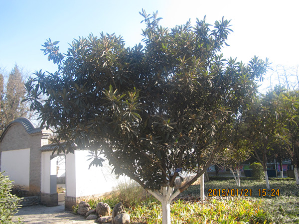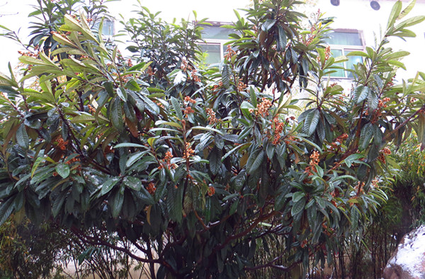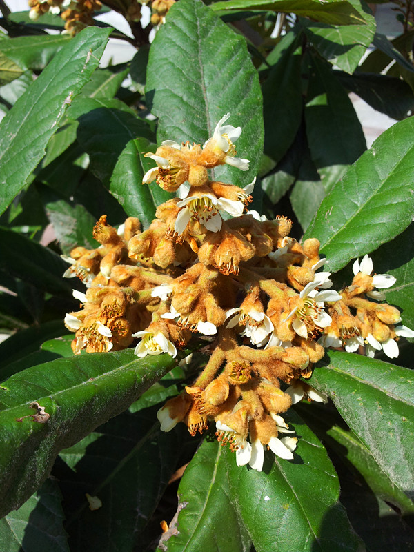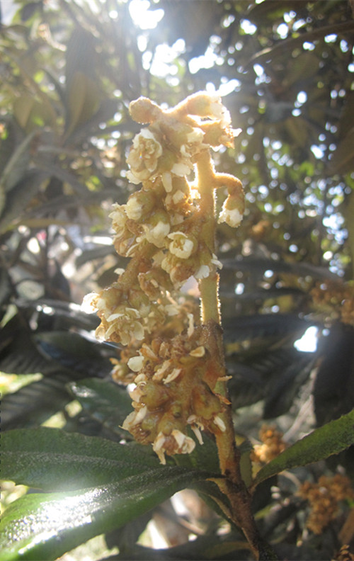 枇杷树又叫芦橘,是蔷薇科枇杷属常绿小乔木。其树冠呈圆形,高3-5米;叶片革质,长椭圆形,终年碧绿,厚且有茸毛,形状如乐器琵琶,故而得名枇杷。枇杷花序圆锥状顶生,每朵花的花柄、花托、萼片均长有密生锈色绒毛。西安地区花期从11月到翌年2月,果期5-6月。