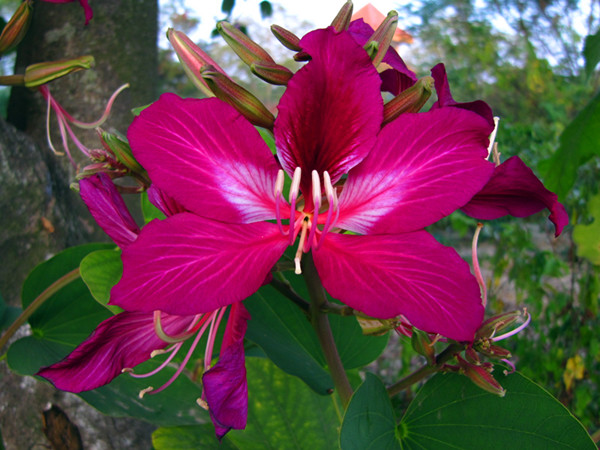 洋紫荆(Bauhinia blakeana Dunn),又名香港?;ǎ湟缎斡琶?,花色娇艳,在华南地区广泛栽培。1997年7月1日香港回归祖国后,其被正式定为香港特别行政区区花,在区徽、区旗上均有其图案,目前是香港行道树的主要树种,也是典型的亚热带常绿高大乔木。洋紫荆叶片心形革质,形如羊蹄甲,且花期多在十月至翌年的三月,花开五瓣,花色紫红,间有白色的脉状彩纹,所以又称红花羊蹄甲。十一月,北方已经进入了萧瑟的冬季,而在福建、香港等地,洋紫荆红花烂漫,开满枝头,人们赐之“兰花树”的美称,意有“壮观、繁荣、奋进”的象征。