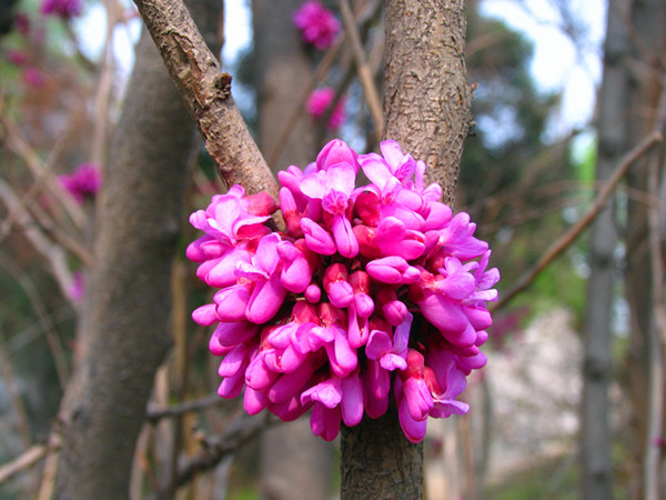 紫荆(Cercis chinensis Bunge),又名苏芳花,暖带落叶灌木,是我国原产的早春观赏花木。其叶互生,近圆形,全缘,主脉五出。阳春三月,当很多树木还没来得及绽放嫩叶之时,紫荆那玫瑰色的蝶形花就先叶开放,一般4-10朵簇生于暗褐色的茎干上,密密层层,满树嫣红,在初春显得极为壮观、美丽,所以又称之为满条红。