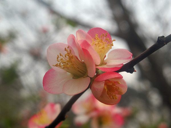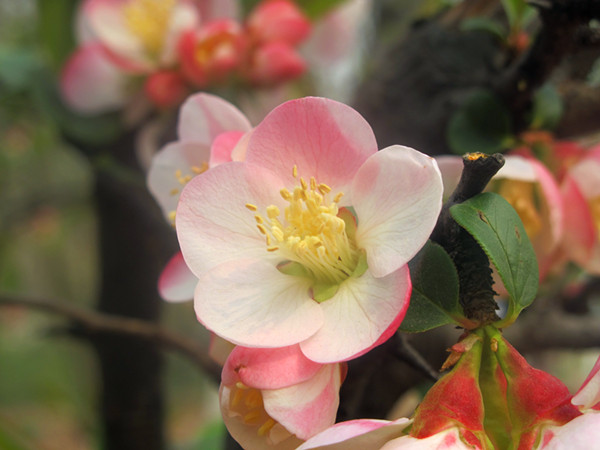 来说一下正当季开花西安植物园常见的贴梗海棠和木瓜海棠吧,先说贴梗海棠吧。它的名字很形象,由于花柄较短,花朵们就像贴在枝干上生长一样,再加上猩红的花色衬着明黄的花蕊,格外惹眼。贴梗海棠的枝干黝黑,常带有天然弯曲,很多人也喜欢将这种落叶灌木制作成传统式的盆景。这股风甚至吹到了海那头的日本,日本人很喜欢贴梗海棠,甚至培育出了新的品种。贴梗海棠的果实长得有点怪,像倒立的梨,所以还得了个别称,叫“铁脚梨”。因为出自木瓜属,贴梗海棠的果实自然也有“木瓜”之名。它的果实晾干后会收缩变皱,所以叫它“皱皮木瓜”。不过,吃起来口感可不大好,又硬又涩,但它有很高的药用价值,可以舒筋活络与化湿和胃。尽管不好吃,但好歹也是木瓜属的。