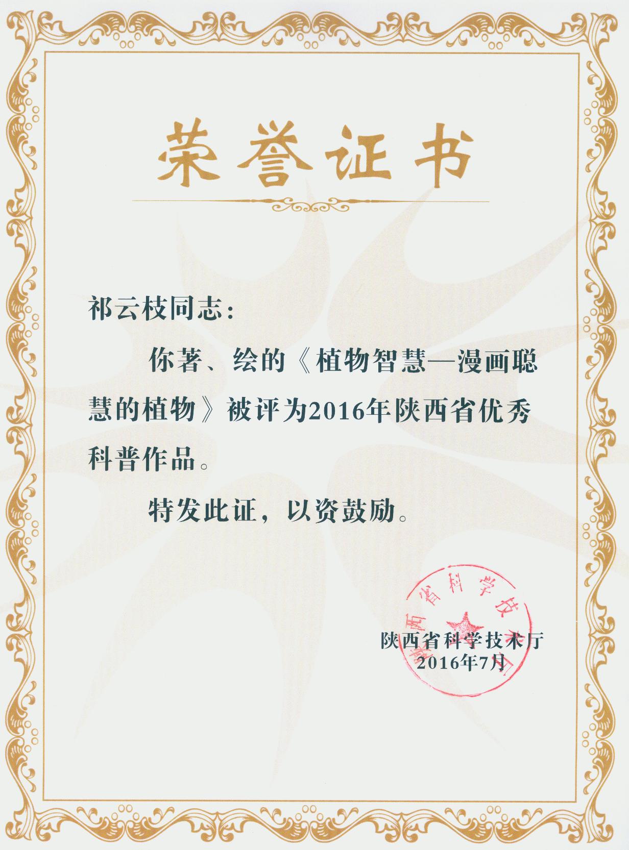 7月13日,在陕西省科技厅举办的2016年陕西省优秀科普作品表彰会上,陕西省西安植物园祁云枝研究员出版的《植物智慧——漫画聪慧的植物》一书,荣获“陕西省优秀科普作品奖”。