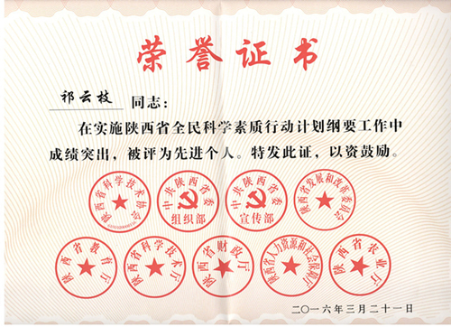 祁云枝本人也荣获由科技部、中宣部、中国科协联合评选的“全国科普工作先进个人”,陕西省《全民科学素质行动计划纲要》“十二五”实施工作先进个人。