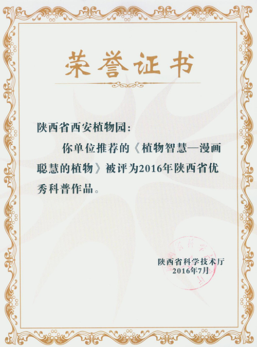 据悉,国家科学技术部于2016年组织开展了全国优秀科普作品推荐活动,共收到来自34个中央、国务院部门和36个?。ㄇ?、市、计划单列市和副省级城市)推荐的298部作品,共计626册图书,集成了近年来各地各部门创作的优秀科普图书及翻译的国外科普精品。本年度共有50部作品获得“2016年全国优秀科普作品奖”,由陕西科学技术出版社出版,西安植物园祁云枝研究员创作的植物科普散文集《植物智慧》名列其中。