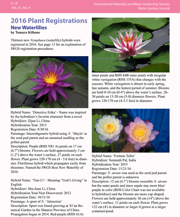 2016年10月30日,陕西省西安植物园李淑娟副研究员培育的睡莲新品种‘天赐’(Nymphaea‘Tian Ci’)国际登录成功,由国际睡莲新品种登录权威Tamara Kilbane女士在国际睡莲及水景园协会(International Waterlily & Water Gardening Society)的官方期刊《Water Garden Journal》上正式公布?!疤齑汀钡某晒Φ锹继畈沽宋沂∧酥廖鞅钡厍ɑ芷分止实锹嫉目瞻?,使我省花卉品种自主知识产权?;さ赜虿饺牍驶?。