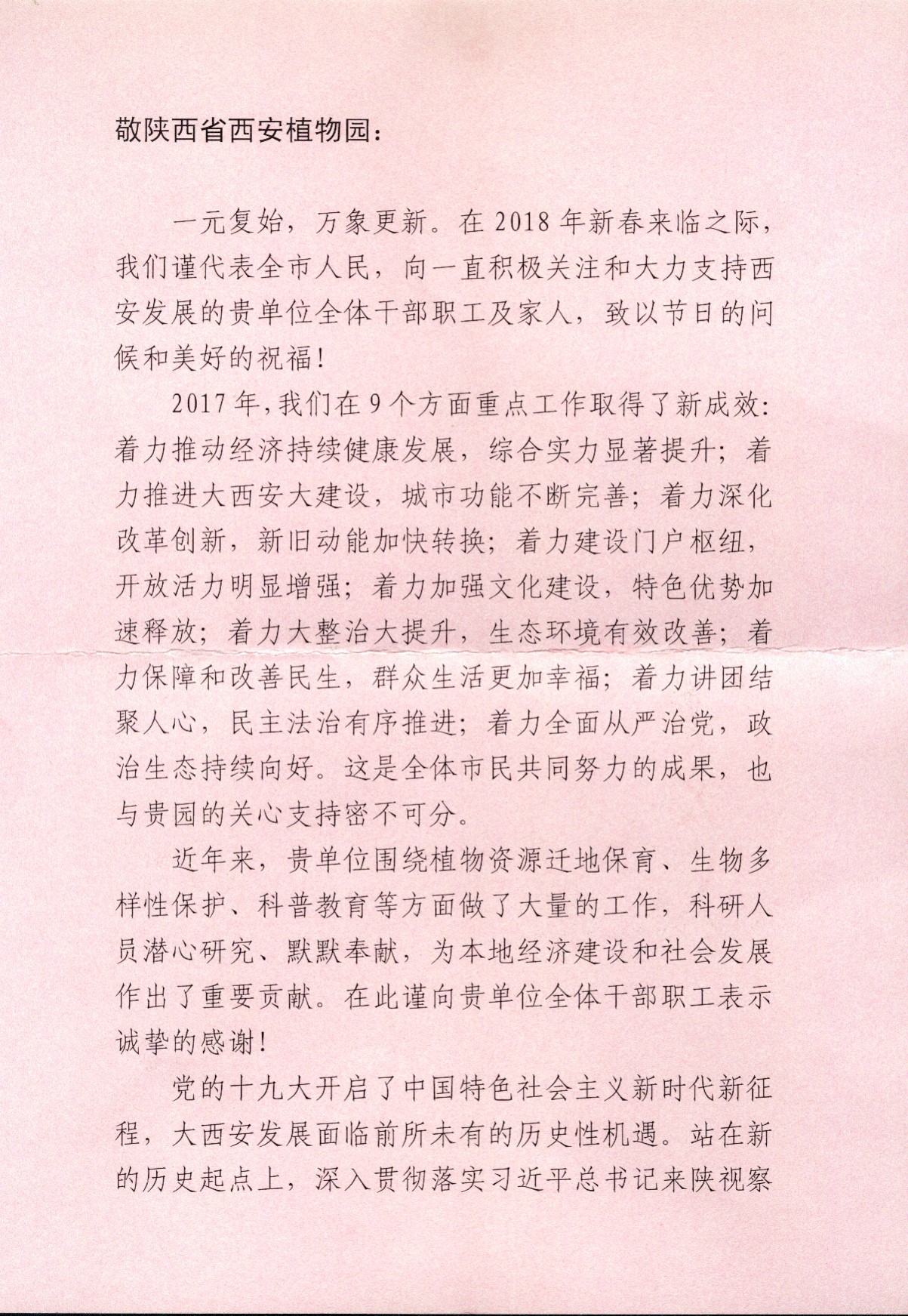 陕西省西安植物园常务副主任杜勇军、副主任刘立成等领导热情接待了李主席一行,并代表植物园全体职工接收了这封饱含浓浓关怀和深情的慰问信。