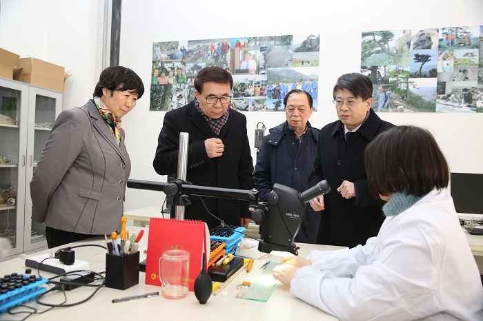 白春礼一行实地调研了西安地球环境研究所加速器质谱中心、生态环境室、古气候研究室、岩芯库和大型太阳能城市空气清洁综合系统,听取了刘禹所长作的工作汇报并作了讲话,对地环所在环境变化研究成果与黄土高原环境治理方面的工作予以肯定。