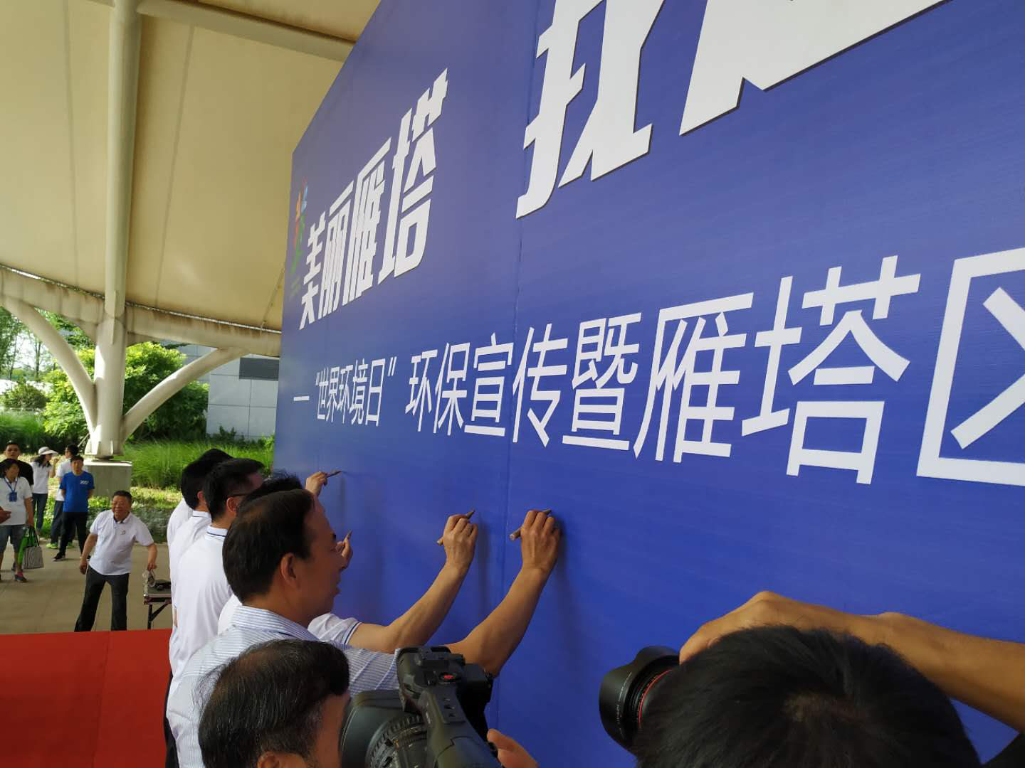 开幕式上,雁塔区区委书记赵小林、区长赵雷带领参与者共同提出倡议,希望大家牢记习近平总书记“环境就是民生、青山就是美丽、蓝天也是幸福,绿水青山就是金山银山,?;せ肪尘褪潜;ど?,改善环境就是发展生产力” 的指示,积极践行绿色、开放、共享理念。通过此次活动,让更多的人了解并参与到环境?;さ墓ぷ髦欣础N靼仓参镌暗澄榧嵌庞戮颓?、区政府等相关领导在主题墙上一一签名。