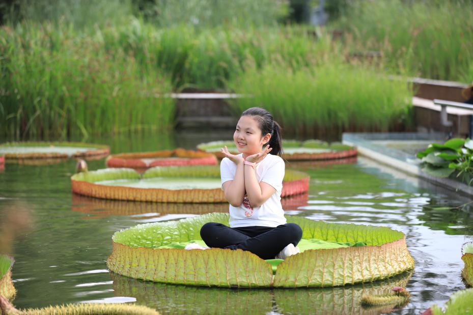 在植物园的水景园内,参加体验活动的8位45kg以下的小朋友,在工作人员的帮助下,按照次序一个个坐在巨大的王莲叶片上,摆出各种可爱的造型,家长和摄影爱好者们纷纷按下快门,记录下孩子们这一神奇且难忘的瞬间。