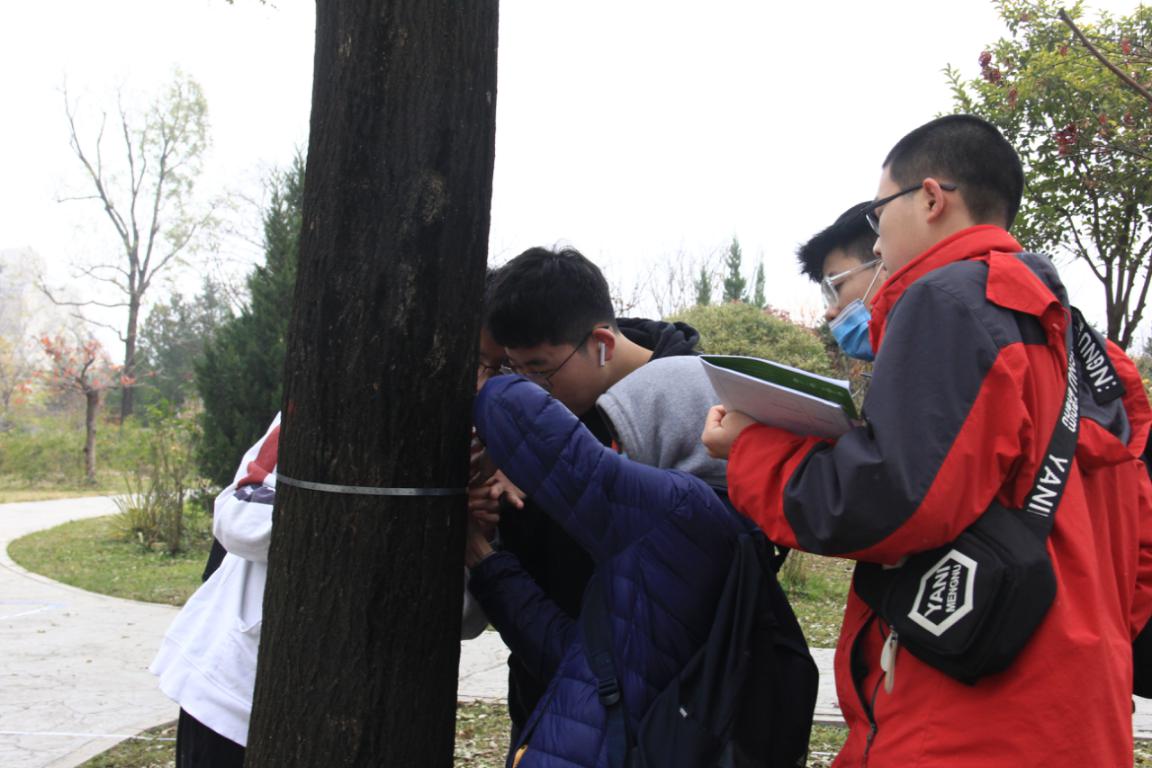 接下来,带队老师带领学生们来到园区内,详细讲解调查内容及工具使用方法后,大家以小组为单位实地取样调查,组员之间相互协作、配合默契,高效率完成了调查任务,通过实地操作,真正掌握了树种调查方法。