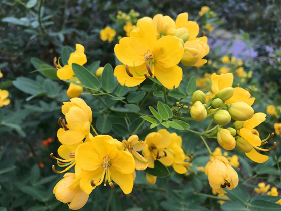 双荚决明(Senna bicapsularis)豆科决明属,落叶灌木,原产美洲热带,在我国西南、华南地区广泛栽培,是夏末及秋季花叶果同赏的药赏两用植物。双荚决明的花是成串成串地挂在枝头的,看上去花团锦簇的,其金灿灿的花朵犹如一只只黄蝴蝶在绿叶中展翅嬉戏,分外吸引眼球。走近看,会发现它的倒卵形叶子边缘有金边,衬托得叶子更加显眼。