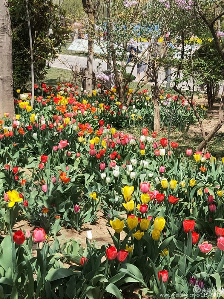 离开那处别致的,又被一群更加妩媚的郁金香捕获。几乎是三步并作两步且不顾脚下还有淤泥地扑向它们的。各色郁金香在这一块儿竞相绽放,“乱花渐欲迷人眼”不就是这般情形么?阳光正好!它们没有那一群色彩的单一显得纯美,可竟也丝毫挑不出任何的瑕疵来,乱的令人心跳加快,交织得令人心旌摇摆,快乐得如同痴者,一个人也能发声赞叹不已!小女孩留恋其前,舞动的裙裾和这些郁金香并无二致,一边欢呼着“真漂亮??!”一边追着花边被她们惊飞的蝴蝶?;ㄕ械?,蝶恋花,童追蝶,好一幅鲜花·稚子·蝴蝶图!浇花人持着水管向那些花儿洒去,它们频频点头,花容依旧,笑颜依旧,出水郁金香,更是娇艳欲滴!别过这群,走向它处。