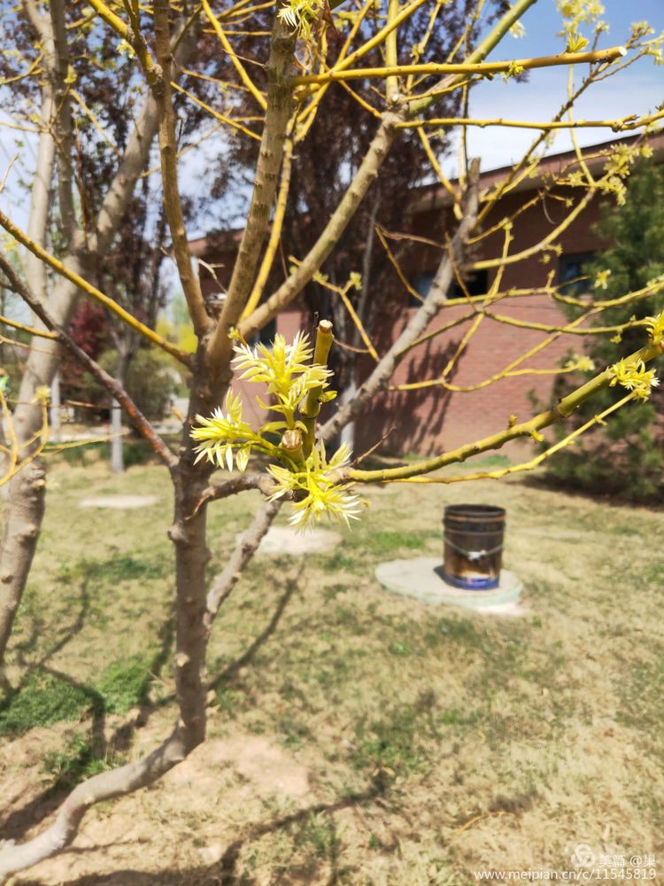 绿色是春的主色调,但总有那么些不落俗套的傲娇存在。不然你看那金枝槐,干枝多于叶,叶那么小,形状那般奇特,且是黄色的,妙就妙在这种黄色不仅没有秋天落叶那种黄的凋零颓败,反倒是黄地厚润,黄得有质感,就像少年紧实的肌肤赋予人力度。驻足其前,远不及在郁金香花前那般烂漫,而是有一种淡然宁静的痴迷与幽思。被自然界这造物主折服,它所造之物必有其用意与神奇之感,它赋予它们智慧,可这种智慧又不尽显露,全凭缘分,全凭悟性似的。虽然它零散在园中,但力度却悠远。
