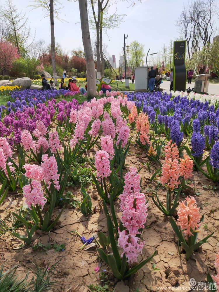 还没从那片花海中回过神来,却被一片风信子俘获。风信子,竟是这般迷人!它不仅花色多,样子更加独特,既有波斯菊的姿色,却与它圆润妩媚形成对比,苗条而娇小些,正在声声惊叹里也才去不肯落去的拍照姿势,不想被谁家稚子吹起的泡泡碰撞了一下,格外清凉。一男子对牵着手的小女孩说:“今晚回去就可以写你看到了什么,花都有什么颜色……”听到这里,我顿觉索然无味,如此景致,这般讲解,不如带着她放飞童心,可劲儿去玩好了,自然生成的心境远比有章法地引领更有味道。我还是羡慕那个穿着一身粉色童装,刚学会走路顶多半年的孩子了,她那年轻的父亲跟在她身边,父亲乐呵呵地告诉她怎样将手中对她来讲有点细长的泡泡藏棒晃出泡泡来,尽管她努力晃悠的动作尽显稚子的不协调,可她父亲依旧灿烂的笑容:“哎……对对对,就这样使劲晃,你真棒!”她细卷的头发在这一切衬托之下,愈发像个洋娃娃了!我在想我那个才不到半岁的小侄女儿,很快,她也会这般大小。多美!多幸福!人不是不该长大,只是突然觉得长大的速度这般迅猛了呢?
