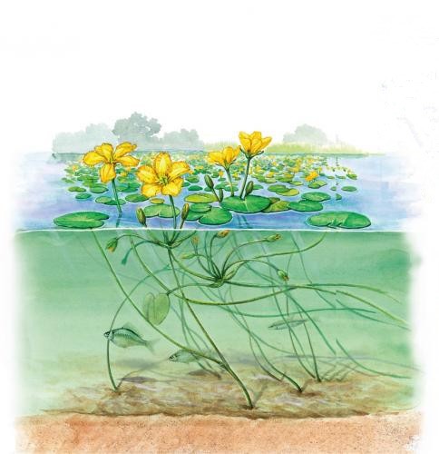 荇菜(Nymphoides peltata):睡菜科荇菜属多年生水生草本植物;荇菜即今天《中国植物志》中的莕菜,古时也写作“莕菜”,李时珍《本草纲目》中说,因其“叶颇似杏”而得名。荇菜的叶片呈卵圆形,上表面亮绿,下表面带紫,基部心形,浮于水面,与睡莲属(Nymphaea)的叶片形状比较相似,因此其属名Nymphoides即表示“像睡莲的”的意思。夏季开花时,鲜黄色的花朵挺出水面,花瓣周边毛茸茸的惹人爱怜。荇菜的叶片漂浮在水面上,根茎深深地扎在水下的泥土之中。从水中望去,一根根纤细的茎条一头连着水面的叶子,一头固定在水底,随着水流不停地摇曳,宛如牵着线的风筝。杜甫的《曲江对雨》中写道:“林花著雨燕脂落,水荇牵风翠带长。” 唐代女诗人薛涛也在《菱荇沼》中描写:“水荇斜牵绿藻浮,柳丝和叶卧清流?!毙熘灸Φ摹对俦鹂登拧分?,有着这样的句子:“软泥上的青荇,油油的在水底招摇;在康河的柔波里,我甘心做一条水草?!笔吮氏驴登湃砟嘀械那嘬?,便是河流中常见的荇菜。