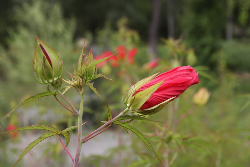 西安植物园内的红秋葵与荷花、睡莲等水生植物一起配植在水景园边,5枚狭长的花瓣,色泽鲜艳,脉络清晰,宛如高挑少女身着的长裙一般。远远望去,枝头上犹如“火球”般热烈的花朵在蓝色天空的映衬下迎着骄阳,开得正欢,那火辣的热情好似感染了整片水景园,似乎也要给炎热的西安再添一把火。正因为这红艳的外表,红秋葵的花语是“热恋”。风起时,“热情”的花浪一浪接着一浪,尽情地展示着自己的美丽。幽淡的花香,清香四溢。缤纷的蝴蝶、勤劳的蜜蜂在花间萦绕,迷失在浓浓的花香里。