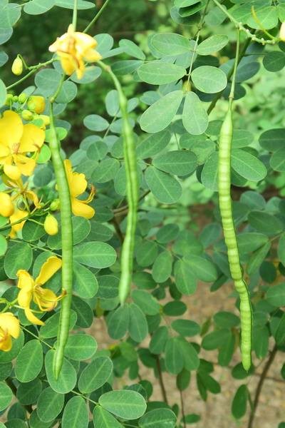 双荚决明的花蕊也比较特别,它共有10枚雄蕊,可是雄蕊的发育却不均衡,7枚能育,3枚退化而无花药,能育雄蕊中有3枚特长且弯曲,高出于花瓣,4枚较小,短于花瓣。双荚决明的雌蕊相对简单,像一根嫩绿色的弯钩。值得重点关注的是由这根雌蕊长成的荚果,开花的同时已经成串地挂在枝头了:圆柱形,成熟后变成黑褐色,就像一根根烟熏过的微型腊肠,它的别名“腊肠仔树”即由此而来。