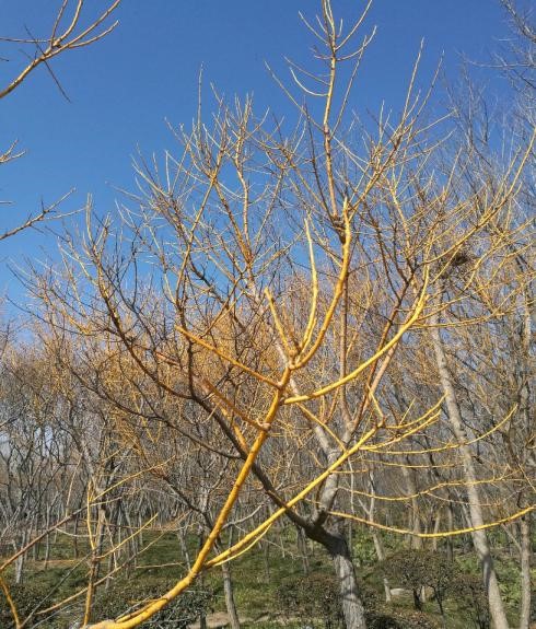 在这充满寒意的季节中,西安植物园中的金枝国槐尤其引人注目,金黄色的树枝在风中摇曳,在蓝天白云的映衬下,美的动人心魄,使得周边的植物都有点儿黯然失色,金枝国槐一枝独秀,成为这片风景当之无愧的“主角”。
