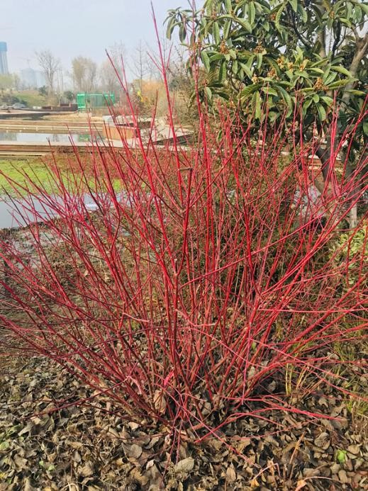 红叶红花都很常见,红色的枝干着实不多。其实无论哪个部分,植物呈现出来的红色都有一个共同的物质基础,就是细胞液里由葡萄糖变成的花青素,酸性的花青素会把红色的长光波反射出来,映入视线就是相应的颜色。