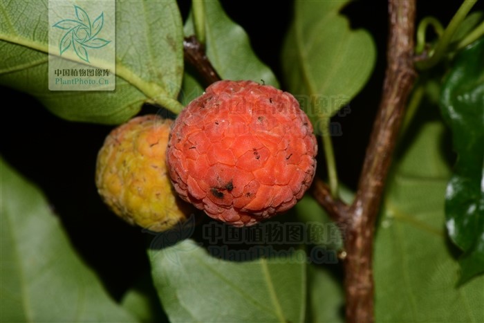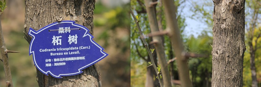 上文中提到的“隋文帝着柘黄袍,巾带听朝。”中的柘黄,传统色彩名,也指染料,其来源于一种植物——柘树。柘树(Cudrania tricuspidata)是??畦鲜舻囊恢致湟豆嗄净蛐∏悄?,是名贵树种,在我国素有 “南檀北柘”之称。柘树和桑树同属???,由于它开花时的聚花果是黄色的,俗称黄桑。柘树具有典型的??浦参锏奶卣?,茎叶上有乳汁。柘树小枝有棘刺,叶片卵形或菱状卵形,偶为三裂。通常在初夏开花,雌雄异株。无论雌花雄花都会聚集成球状,黄色,雄花内含雄蕊,而雌花开放后,会有柱头从花中伸出,之后渐变为绿色的未成熟果实,直到秋季成熟后变为桔红色,有点像荔枝。果可食用又能酿酒,口味略带酸甜。