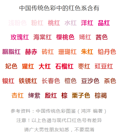 东汉《说文解字》中将“红”解释为“帛赤白色也”,清代学者段玉裁对于此条的注释为:“此今人所谓粉红桃红也”,也就是说古人眼中的红类似于今人眼中粉红。在我国古代,对红色的区分和口红色号的复杂程度不分伯仲。古代将原色的红称为赤色,而称橙红色为红色。