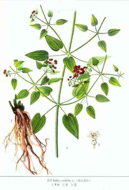 茜草( Rubia cordifolia) 茜草科茜草属,草质攀援藤木。其生命力极强,房前屋后、抛荒农田、城市的犄角旮旯都是它们的生活区域。在东北、华北、西北和四川(北部)及西藏(昌都地区)等地都有其分布。茜草小枝四棱,棱上生倒生皮刺;根紫红色或橙红色。叶4片轮生,披针形或长圆状披针形,先端渐尖,叶基部圆至心形,表面粗糙,背面叶脉有倒钩刺。聚伞花序腋生和顶生,多回分枝,有花十余朵至数十朵??粕男』ǎ庑┬』ㄒ?为数——5片花瓣和5个雄蕊,每朵花的个头只有绿豆大小。果球形,成熟时橘黄色?;ㄆ?-9月,果期10-11月。