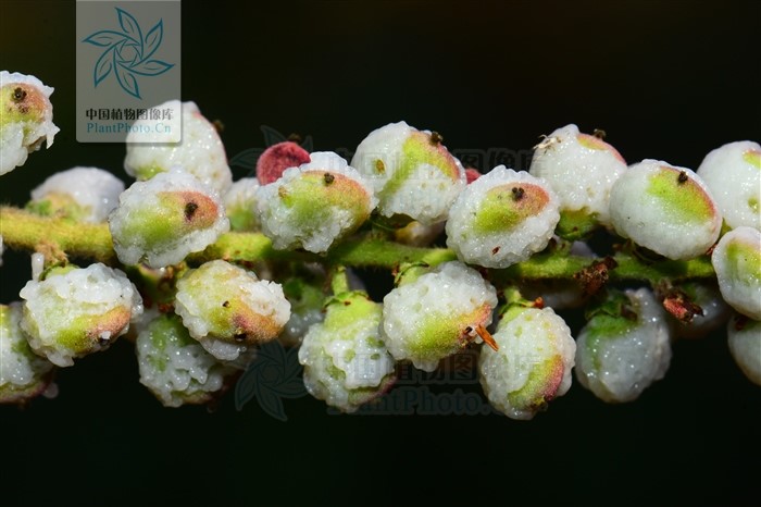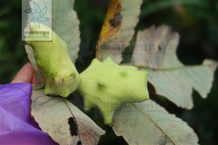 盐肤木还有另外一个更加著名的名字“五倍子树”。所谓五倍子,就是一种寄生在盐肤木的蚜虫在其幼枝和叶上形成的虫瘿。虫瘿其实就是寄生生物生活的“房子”,是植物组织遭受昆虫等生物取食或产卵刺激后,细胞加速分裂和异常分化而长成的畸形瘤状物或其他形状的突起。用于染色的部分也不是虫子本身,而是被虫叮咬的部位。主要是因为被叮咬的树皮会分泌出单宁物质(又称鞣质,是一种具有多元酚基和羧基的有机化合物)。当单宁和铁盐作用时,就可将织物染成黑色?!侗静莞倌俊分卸云渑嘀灿兴樯?,须“生于肤木叶上”。同时指出了五倍子的染色功用: “九月采子,曝干,染家用之……皮工造为百药煎,以染皂色,大为时用?!?/font>