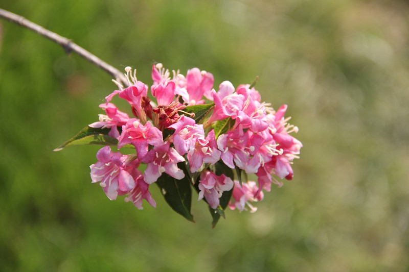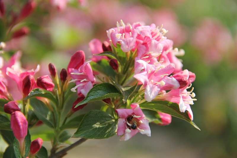 锦带花的花期正值春花凋零、夏花并不繁多的时候。它花色艳丽,花开时团团锦簇,似彩带、如云霞。如果你俯下身来仔细观看一朵朵小花,你会发现,锦带花花冠呈现漏斗状钟形,花萼上部裂成5片,中部以下连合,这是为了让昆虫帮助其更多的传粉而使用的“小伎俩”。好花还要绿叶配,锦带花叶矩圆形、椭圆形至倒卵状椭圆形,边缘有锯齿,质感的确也有点像布匹,配合长长的枝条,也难怪古人会生出其像一条织锦般的腰带一样的联想了。