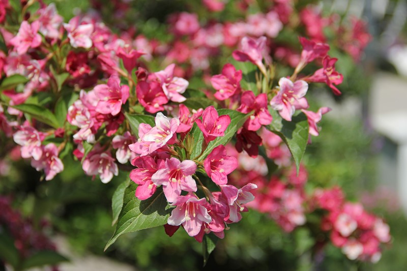 锦带花(Weigela florida)忍冬科锦带花属,落叶灌木。锦带花的枝条细长柔弱,浓密的绿叶旁缀满缤纷花朵,似仙女织出的锦带,锦带花因此得名。宋代诗人杨万里曾赞美锦带花:“天女风梭织露机,碧丝地上茜栾枝。何曾系住春皈脚,只解萦长客恨眉。节节生花花点点,茸茸晒日日迟迟。后园初夏无题目,小树微芳也得诗。”把锦带花比做仙女用风梭露机织出的锦带,上面坠满了宝石般的花朵。