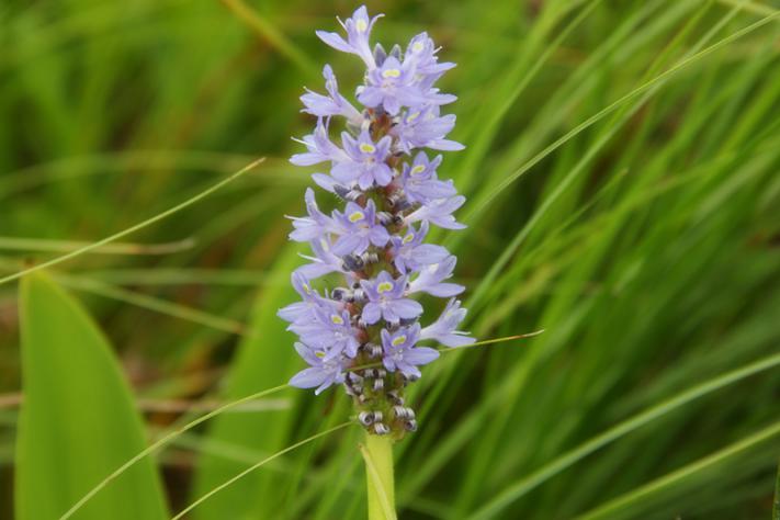 梭鱼草蓝紫色的小花紧凑地挤在穗状的花序上,生于叶柄的顶端,显得毛茸而可爱。若凑近仔细观察它的花朵,可以发现单花是6瓣儿的,两侧对称,最上方花瓣上还有明显的两个黄绿色斑点,让人忍不住想起同为雨久花科的凤眼莲(也就是俗称的水葫芦),仿佛一只灵巧蹁跹(pián xiān)的精灵,眷恋着花丛?;螅笥悴莸幕ò昊狎樗跗鹄?,为其他的花的开放留出足够的空间。梭鱼草叶片为绿色或者深绿色,低于花序,微微卷曲,茎叶较长,模样也甚可观赏。