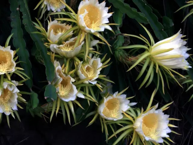 量天尺的茎狭长,三棱有节,状如节鞭,向四处蔓延,好像似楚霸王使用的马鞭一样,所以在广东、广西有些地方把量天尺叫“霸王鞭”,由于量天尺有“霸王鞭”的别名,开的花就被称为“霸王花”。从外观上看,“霸王花”名副其实。漏斗状的花朵长25-30厘米,直径15-25厘米。量天尺的花于夜晚开放,开花时会散发出香气,形状和昙花很像,花谢之后,一个个火龙果就挂满枝头。“霸王花”虽然自交亲和,但自然状态下柱头和花药距离很远(因为花太大),很难自动完成自花授粉而结果。而在中美洲的原产地它是依赖蝙蝠传粉的,而中国并没有这些蝙蝠,所以在自然条件下,中国的量天尺结实率极低。美洲之外的种植者当然不可能把蝙蝠传粉者也引种过去,而大半夜挨个做人工授粉的成本又太高了,怎么办呢?这种情况下,火龙果自交亲和的特性被利用了。果农只需在开花前用一个夹子夹住花蕾先端,这样花冠无法展开,雄蕊雌蕊都挤在一起,花药开裂时花粉就都落到柱头上了。接下来只要施够肥等着果实成熟就好。(红心火龙果必须把花粉传到另一棵植株上,才能结出果实,所以要人工一朵一朵地授粉)。剖开火龙果的外衣,就会看到白色果肉上“撒满”千万粒芝麻黑点,它们就是火龙果的种子。