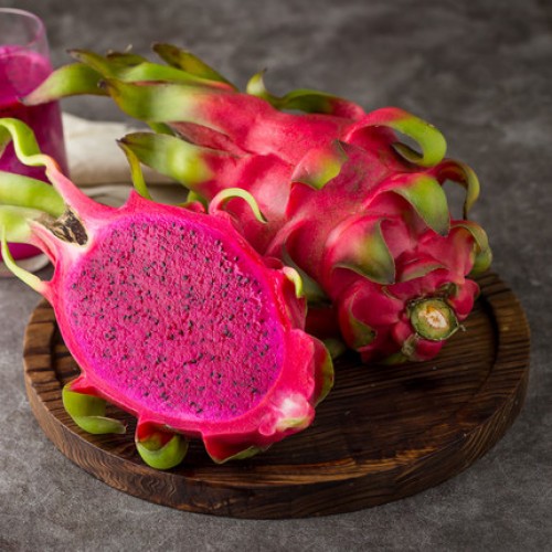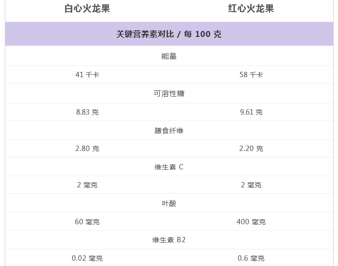 人类为了追求更甜美的口感,培育出了红心火龙果。而红心火龙果在营养上还真比白心火龙果有些优势。红心火龙果的叶酸和维生素B2的含量分别是白心火龙果的 6.7 倍、30 倍。因此,100 克的红心火龙果就能满足成人一天的叶酸需求,也能满足成年普通女性 1/2 的维生素 B2 的需求。