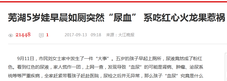 其实,红心火龙果里的红色,来自一种特别的色素——甜菜红素。这种色素比较稳定,不会被人类的消化系统所破坏。于是,吃进去的色素又原样出来了。更有意思的是,这种色素还会进入我们的尿液,于是就有了“尿血”的情况,不过遇到这种情况也不要惊慌,因为甜菜红素只是个天然色素,并没有毒性,只要多喝点水,尿液很快就会恢复正常颜色。然而有些商家宣传说红心火龙果花青素含量高、保健效果强大等等,其实它除了让你的尿变红,并没有其它作用。