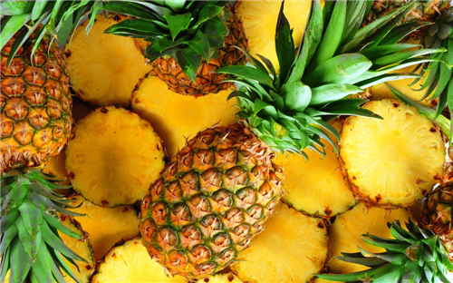 菠萝含有丰富的维生素C、锰、维生素B6、叶酸、镁、鉀等,不仅可以解腻助消化,还有生津止渴的作用。当我们选购菠萝时,我们可以从它的鳞甲判断成熟度,硬邦邦按不动就是还得放放的,一按就出水的那是熟透快烂的,挺实而微软的成熟度较好,除了手感还要参考颜色,九成熟的菠萝是橙黄色的买来就能吃,八成熟的是亮黄色的需要放两天才能吃。