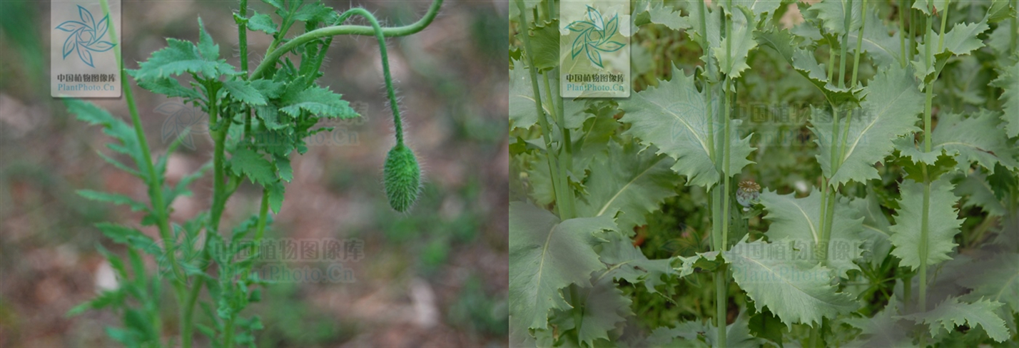 罂粟:罂粟全株光滑无毛且覆盖有一层白粉。另外,它们的叶子会环抱在茎秆之上。茎粗壮,茎秆分枝少,叶厚实。