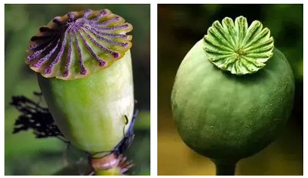 罂粟:果实较大,大概有4~7cm,果实呈坛状,顶部有明显的王冠样,果实比较光滑、直立。?