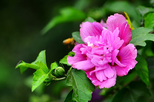 木槿(Hibiscus syriacus)锦葵科木槿属,落叶灌木。李商隐《槿花》中“风露凄凄秋景繁,可怜荣落在朝昏”感叹木槿花朝开暮落,美在“瞬息”之伤感;木槿单花花期只有一天,一般早晨5点左右开放,晚上7点左右就凋谢了,但是花朵不是枯萎,而是整朵掉落。故此,木槿又名“朝开暮落花”。