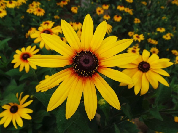 黑心金光菊,因“色”得名。虽然名字叫“黑心”,其实,只要仔细观察,你会发现它们的花心一点儿都不黑心,只是天生的暗褐色或暗紫色,有点儿接近黑色罢了。黑心金光菊中间的是它们的管状花,而外面一圈金黄色的,一般认为是花瓣的,其实是它们的长圆形舌状花。黑心金光菊的花心会随着开放程度慢慢隆起,暗褐色的花心和旁边金黄色的舌状花形成鲜明的对比,有些舌状花的基部还带着一轮紫晕,在阳光下,确实是显出一层金色。